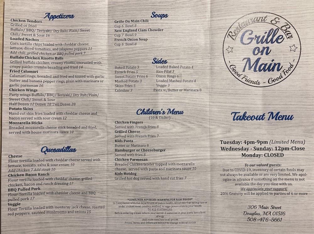 Welcome to Grille on Main Restaurant & Bar, your ultimate dining destination in Douglas, MA. Located at 306 Main St, we offer a cozy atmosphere perfect for lunch, dinner, or a casual night out. Enjoy our exceptional grilled specialties paired with an extensive selection of local beers and fine wines. Indulge in our handcrafted cocktails and delightful desserts while catching the latest sports on our screens. With options for dine-in, takeout, and delivery, we cater to all preferences, including vegetarian choices. Our accessible facilities ensure everyone can enjoy our inviting ambiance and quick service. Join us for a memorable meal!